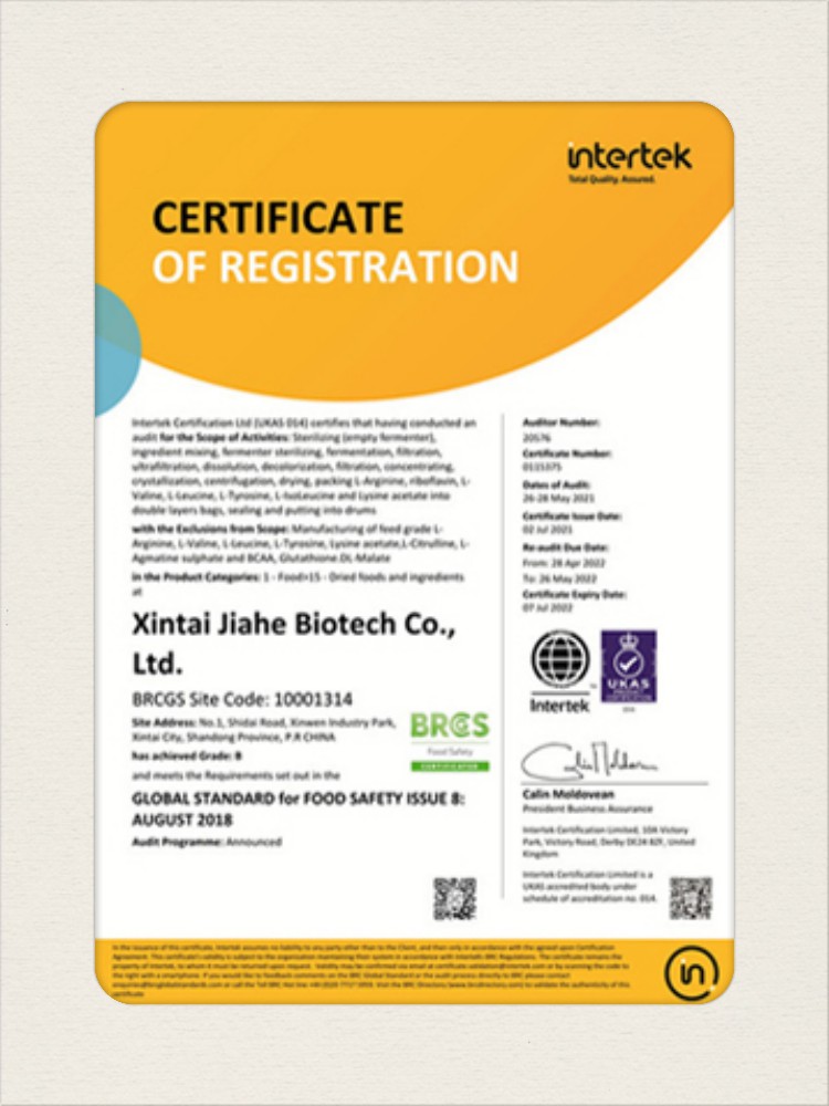 汕頭佳禾生物科技有限公司是一家致力于氨基酸及其衍生物研發(fā)、生產(chǎn)和銷售的國家高新技術(shù)企業(yè),先后通過了國家藥品GMP認(rèn)證,ISO9001質(zhì)量體系認(rèn)證、ISO14001環(huán)境管理體系認(rèn)證。目前,公司擁有“廣東省專精特新中小企業(yè)”、“廣東省氨基酸產(chǎn)品工程技術(shù)研究中心”、“汕頭市生物發(fā)酵工程技術(shù)研究開發(fā)中心”、“汕頭市知識產(chǎn)權(quán)優(yōu)勢企業(yè)”、“多項(xiàng)國家發(fā)明專利”、“廣東省守合同重信用企業(yè)”等多項(xiàng)資質(zhì)和榮譽(yù),旗下“佳禾牌”系列產(chǎn)品已成為原料藥行業(yè)知名品牌。 新泰市佳禾生物科技有限公司成立于2012年8月,注冊資金2億元,公司位于山東泰安新泰市新汶工業(yè)園區(qū),是國 家級高新技術(shù)企業(yè)、山東省“專精特新”企業(yè)、山東省制造業(yè)單項(xiàng)冠軍企業(yè)、泰安市科技型中小企業(yè)、泰安市農(nóng)業(yè)產(chǎn)業(yè)化龍頭企業(yè)、中國生物發(fā)酵產(chǎn)業(yè)協(xié)會理事單位。